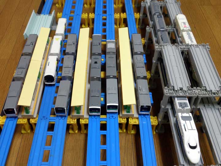 このような中途半端な状態でしばらく工事中断していましたが、2011年暮くらいから再開しました。 手前の山手線は、通常型のプラレールではありません。テコロジープラレール+東京駅プラレールショップ限定ラッピング中間車+マクドナルドのおまけ、を連結したもの。 |